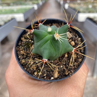 Cacto globular de cor verde-azulada. Quando pequeno, seus tubérculos são bastante avantajados de onde cada uma de suas aréolas produzem vários espinhos amarelos, finos, compridos e rijos. Há um espinho central e aproximadamente 8 radiais.