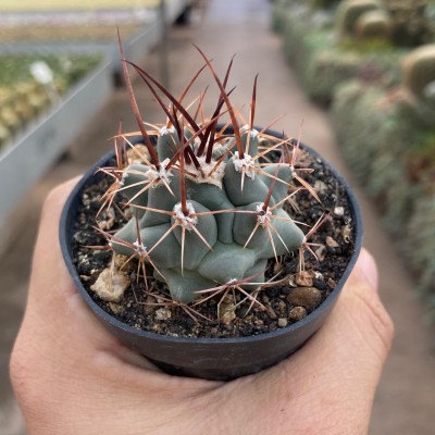 Cacto globular, de cor verde azulada. Produz de 0 a 5 espinhos radiais por aréola; produz de 0 a 4 espinhos centrais, por aréola. Seus espinhos são cinzas com tons vermelho amarronzados. Às vezes, alguns dos espinhos centrais do ápice da planta ficam levemente encurvados. Produz flores brancas.