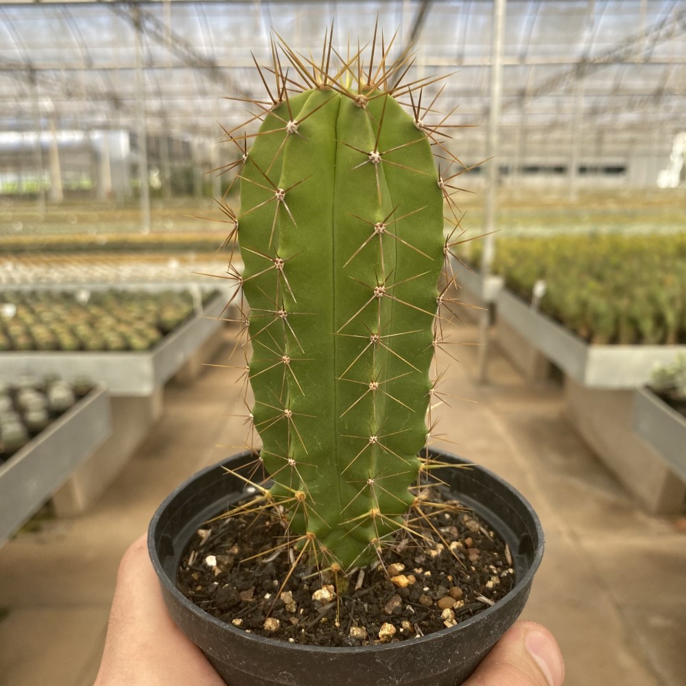 Cacto colunar de cor verde. Produz cerca de 6 espinhos radiais amarelos, por aréola.