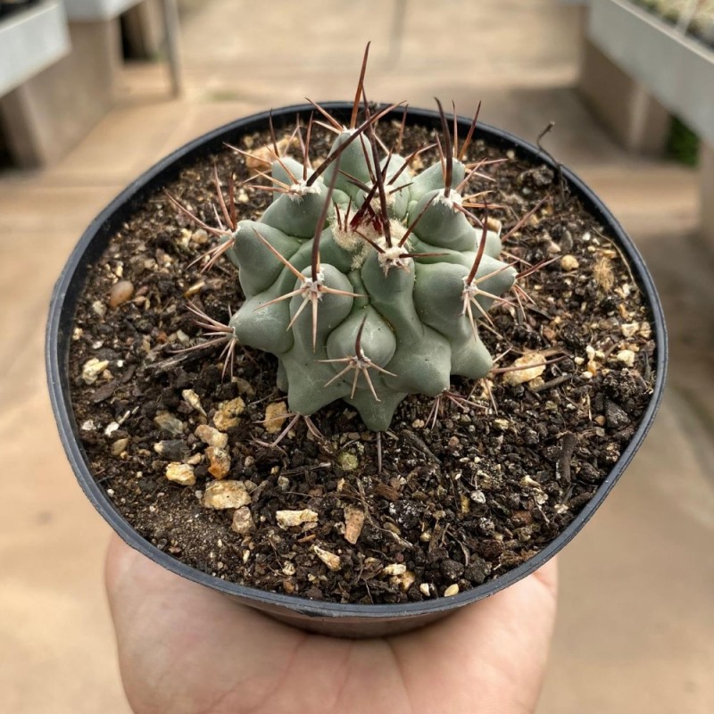 Cacto globular, de cor verde azulada. Produz de 0 a 5 espinhos radiais por aréola; produz de 0 a 4 espinhos centrais, por aréola. Seus espinhos são cinzas com tons vermelho amarronzados. Às vezes, alguns dos espinhos centrais do ápice da planta ficam levemente encurvados. Produz flores brancas.