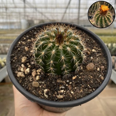 Cacto de forma globular a pequeno cilíndrico com depressão no ápice, de cor verde-escura. Produz cerca de 12 espinhos radiais branco a acinzentado, com pontas levemente avermelhadas, cujas pontas, às vezes, são levemente curvadas, por aréola; produz cerca de 3 espinhos centrais parecidos com o radiais e geralmente um dos centrais é mais longo que os outros e acaba sendo mais encurvado como um anzol, por aréola. Produz flores laranja avermelhadas que saem do centro da coroa.