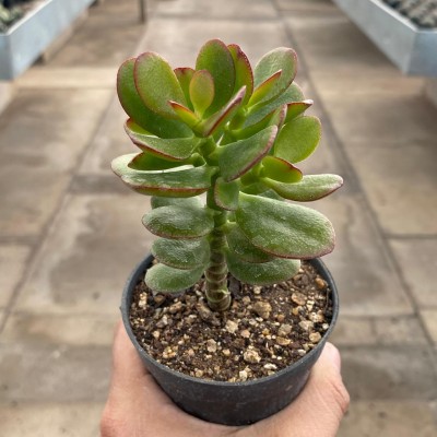 É uma suculenta que cresce em formato de arbusto com folhas verdes arredondadas e lisas podendo avermelhar a coloração se expostas ao sol. Suas flores brancas se apresentam a partir de cachos que surgem do centro da planta.