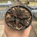 De rosetas abertas geralmente solitárias, suas folhas são rígidas e triangulares de cor marrom com margens avermelhadas e pequenos tubérculos por toda sua superfície. As flores brancas surgem no ápice de hastes que surgem diretamente do centro da planta.