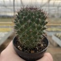 Cacto cilíndrico de cor verde escura, nativo do México. O Gênero Mammillaria é reconhecido por não possuir costelas, seus tubérculos são espalhados pelo corpo do cacto e lembram pequenas mamas. Possui 4 espinhos centrais de base branca e ponta preta por aréola. Suas aréolas e suas axilas produzem pelugem que cobre a planta. Produz algumas flores rosas em uma coroa arrodeando o ápice do corpo do cacto.Esta planta possui mais de 20 anos.