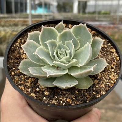 Roseta azul esverdeada ligeiramente plana de folhas côncavas e ligeiramente convexas no seu ápice. As margens das folhas novas são deformadas, diferente das folhas mais velhas, que estão melhor estruturadas.