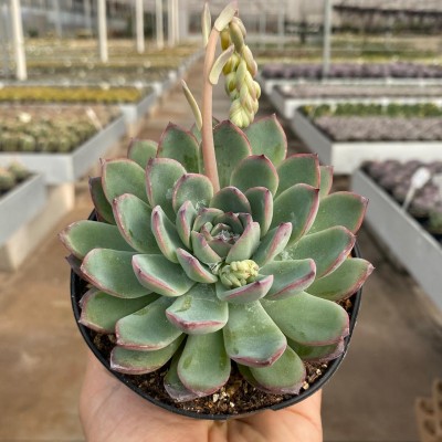 Predominantemente de tom cinza esverdeado, essa é uma Echeveria de pequeno porte. Suas folhas são arredondadas e têm margens que são bem demarcadas por vermelho.