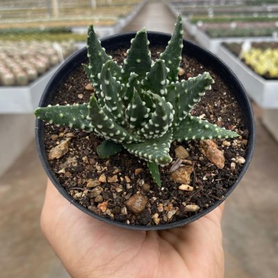 É uma suculenta de cor verde com folhas triangulares, pontudas, sem margens formadas e arqueadas para cima. Há tubérculos circulares e elevados distribuídos por toda sua superfície interior e exterior. Produz flores brancas dispostas no ápice de hastes florais.