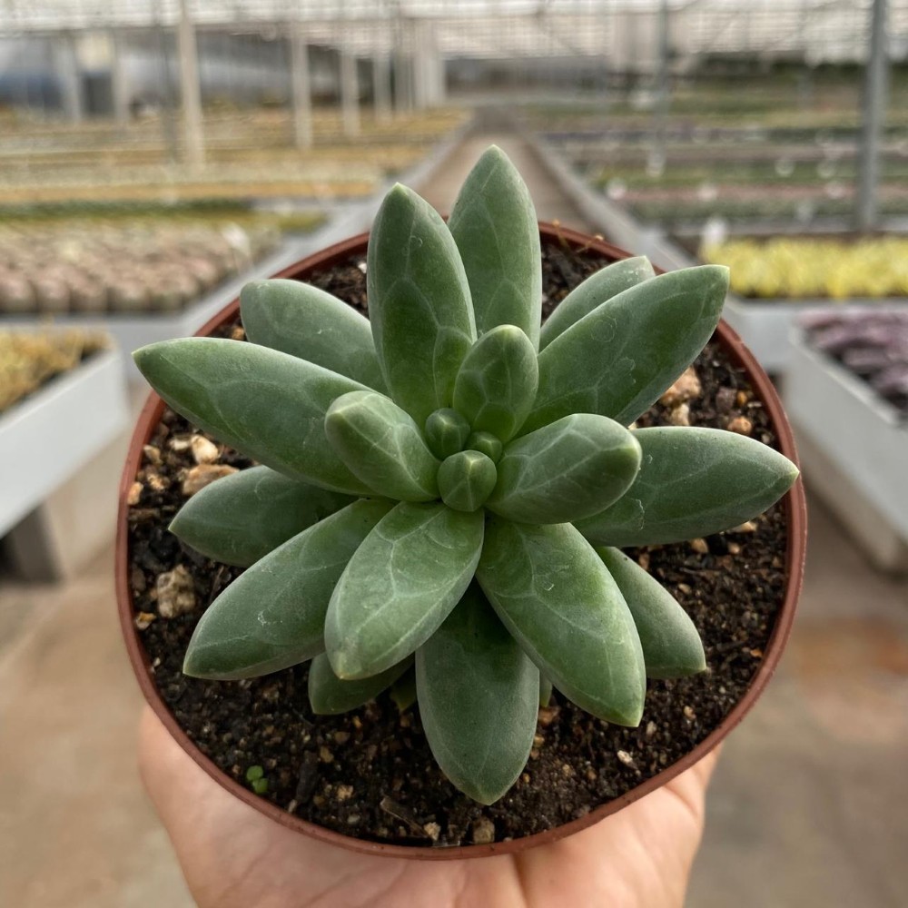É uma suculenta de rosetas extremamente densas, sem caule aparente. As folhas verdes são carnudas e arredondadas com várias faces na superfície superior. Durante a primavera flores vermelhas dispostas em cachos coroam esse Pachyphytum.