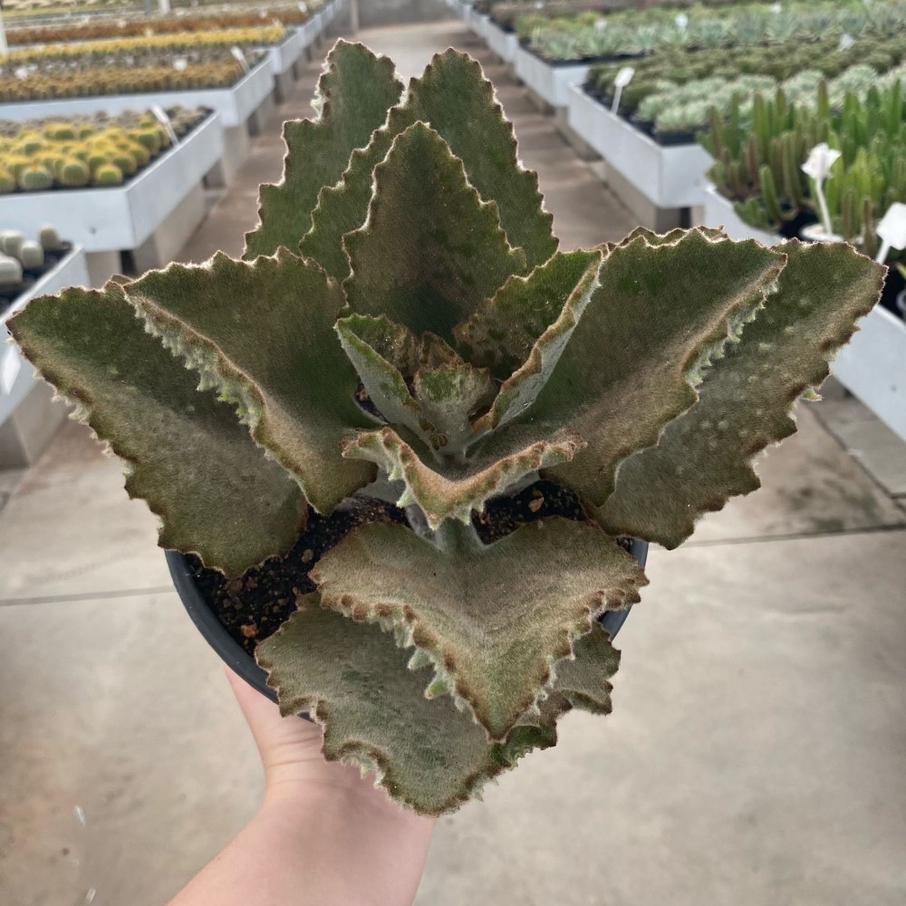 As folhas largas de tonalidade amarronzada com o ápice mais escuro apresentam uma fina camada de pelos por toda sua superfície superior, já na superfície inferior e margens manifesta algumas protuberâncias.