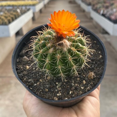 Cacto de forma globular a pequeno cilíndrico com depressão no ápice, de cor verde-escura. Produz cerca de 12 espinhos radiais branco a acinzentado, com pontas levemente avermelhadas, cujas pontas, às vezes, são levemente curvadas, por aréola; produz cerca de 3 espinhos centrais parecidos com o radiais e geralmente um dos centrais é mais longo que os outros e acaba sendo mais encurvado como um anzol, por aréola. Produz flores laranja avermelhadas que saem do centro da coroa.