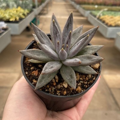 Com folhas estreitas, curvadas e pintadas de vermelho ou preto nas pontas, essa pequena Echeveria de cor cinza sombreada à violeta, atinge até 10 cm de diâmetro.