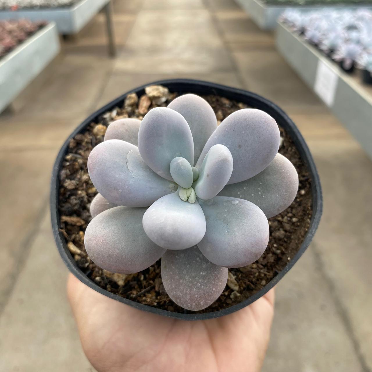 De caule branco, as folhas das densas rosetas desse Pachyphytum tem tonalidade arroxeada e azulada. São carnudas e arredondadas, sem margens formadas, além de possuir pruína. Flores avermelhadas aparecem durante o inverno no ápice de hastes de mesma cor.
