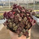 É uma suculenta pendente que apresenta pares de folhas opostas na cor roxa em formato de coração.