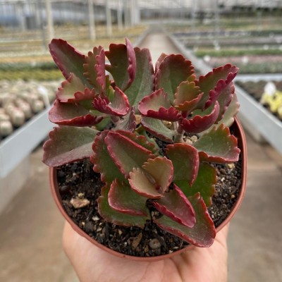 Um Kalanchoe que atinge até 1 metro de altura. Suas folhas são côncavas com margens recortadas e arredondadas. Vermelho é a cor predominante nas folhas novas e marrom nas folhas mais velhas. As flores amarelas aparecem em cachos que estão dispostos sobre hastes florais.
