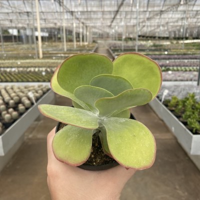 Pertencente a família Crassulaceae, essa suculenta tem folhas ovais e largas de cor verde com centro levemente acinzentado e margens avermelhadas, que se intensificam se cultivadas a pleno sol, além de ter pruína por toda sua superfície. Suas flores amarelas surgem a partir de cachos e aparecem entre o verão e o inverno. É popularmente conhecida como "orelha de elefante".