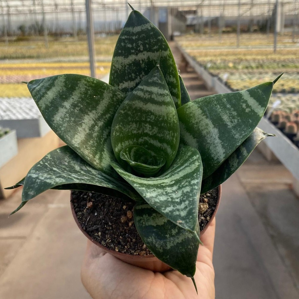 Suas folhas são largas e côncavas, com ápice afiado e arqueado para baixo. É de cor verde clara com listras transversais mais escuras. É nativa da África Ocidental.