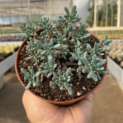 Pertencente à família Crassulaceae, é uma suculenta de crescimento rasteiro ou pendente. Suas folhas são pequenas, finas, arredondadas e arqueadas para cima. É de coloração azulada, como sugere o nome.