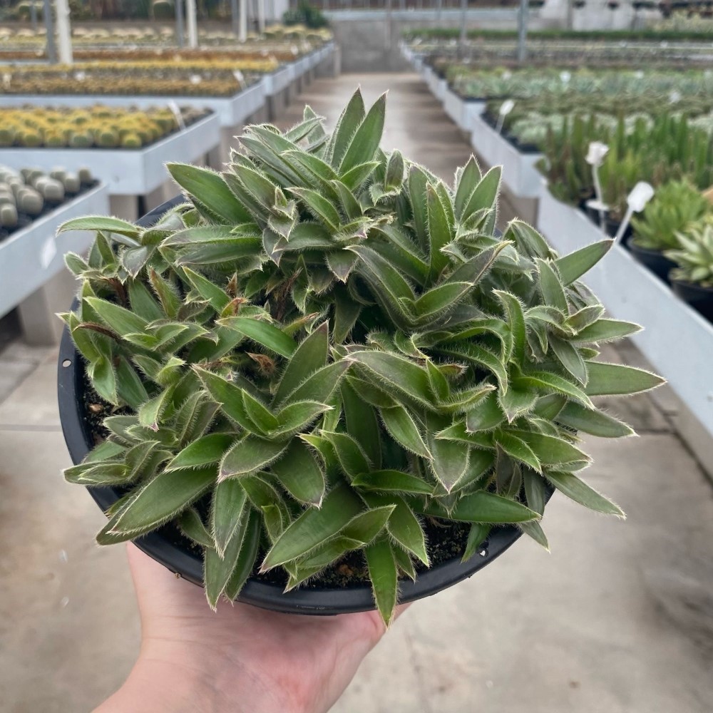 É uma planta que pode ser cultivada sob luz forte. Suas folhas verdes são côncavas e lanceoladas com pelos brancos nas margens.