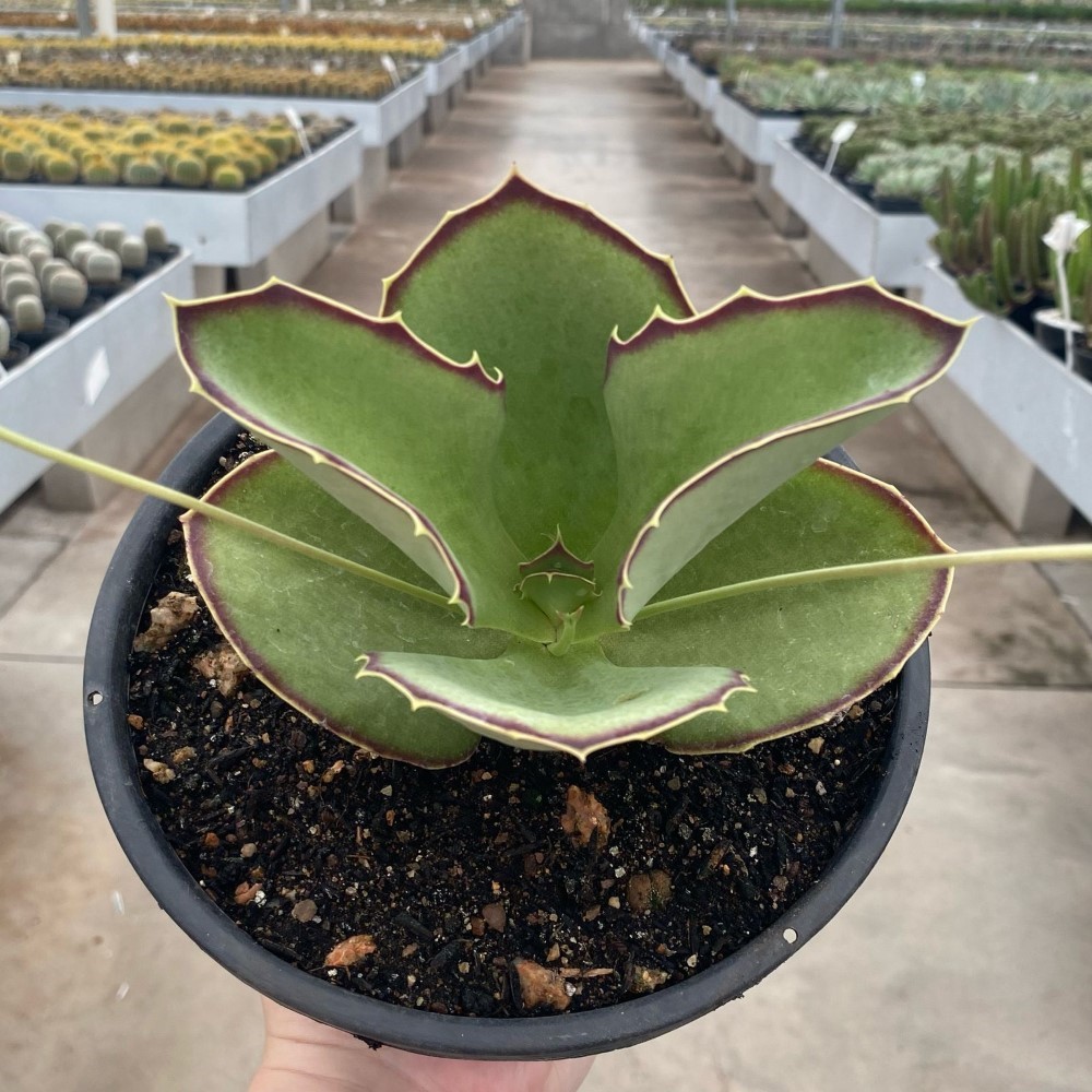 Suas rosetas são compostas por folhas que são largas e côncavas de cor verde. As margens são vermelho-rosadas e tem pequenos dentes inofensivos. As flores avermelhadas estão dispostas em cachos e no ápice de uma haste floral que surge exatamente do centro da planta. Estas, surgem durante o outono.